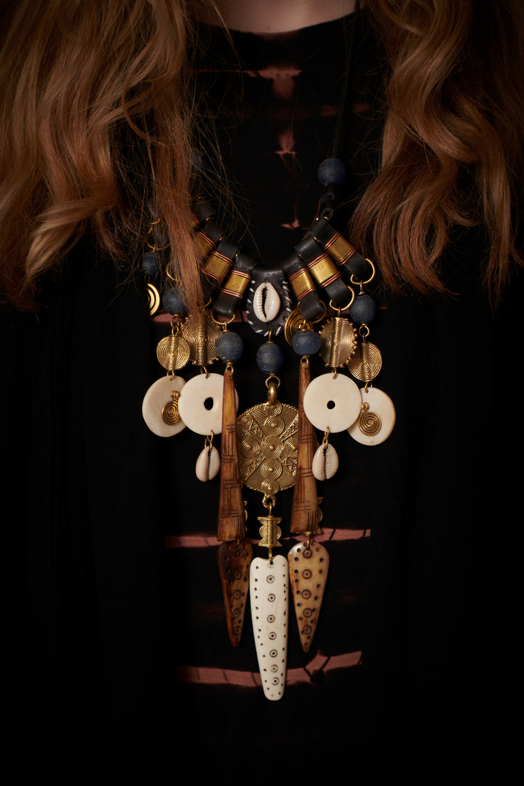 Unique African Wodaabe tribe leather and brass with camel bone, cast brass and old blue glass beads. Unique piece, handmade in Kenya.